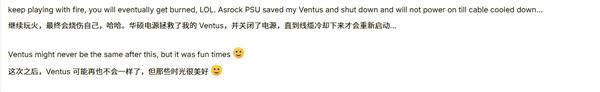 玩家事后坦言自己是在玩火,“继续玩火,迟早会烧到自己。华擎电源救了我的显卡,它在连接器冷却之前不会重新启动……虽然Ventus可能再也回不到从前了,但过程确实很有趣。”